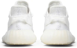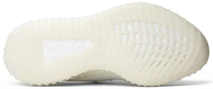 The luminous colored adidas Yeezy Boost 350 V2 has a cream white upper, core white midsole, and a camouflaged "SPLY-350" branding across the stripe on the sides.