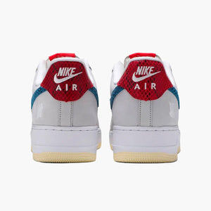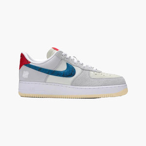 Taken from the second installment of the LA retailer’s ‘Dunk vs. AF-1’ series, the Undefeated x Nike Air Force 1 Low ‘5 On It’ takes inspiration from sneaker culture during the late ‘90s and early 2000s, a period when exotic materials reigned supreme. This pair makes use of a light grey leather upper with tonal suede overlays and blue and red snakeskin on the Swoosh and heel tab. Undefeated’s Five Strikes logo decorates the lateral heel and an orange woven tag atop the tongue. The sneaker rides on a crisp white rubber midsole and cream-colored pivot-point outsole.