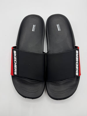 Add a pop of neon fun to your casual look with Skechers Grey Slides featuring a vibrant neon side detail. Designed for easy slip-on comfort and a playful touch, these slides keep your feet cozy and your style bright wherever you go!