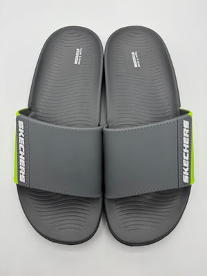 Add a pop of neon fun to your casual look with Skechers Grey Slides featuring a vibrant neon side detail. Designed for easy slip-on comfort and a playful touch, these slides keep your feet cozy and your style bright wherever you go!